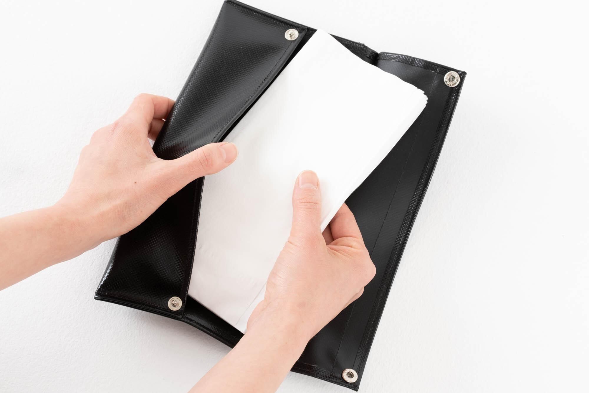 Both the front and back sides are coated with vinyl, making it recommended to use it for "storing wet items" such as wet tissues or sweat wipes, as well as for a "dustbin," since both sides are waterproof."